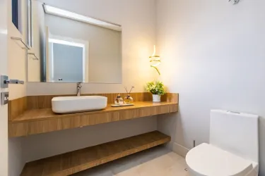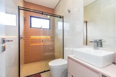 ** Toda a casa com piso em porcelanato no mesmo padrão, dando uniformidade e aquecido nas áreas privativas.