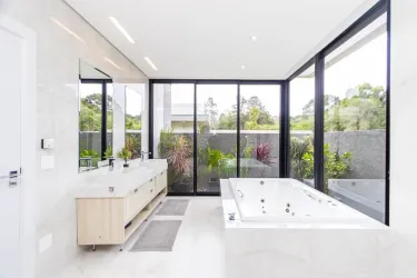 ** No lado oposto à cozinha, acesso a estar íntimo que atende a três grandes suítes com closet e BWC. A suíte do casal dispõe de maiores dimensões, inclusive com enorme closet e banheiro completo com cubas e duchas duplas, hidromassagem e jardim com amplas janelas e muro dando privacidade.