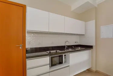 – 01 cozinha com armários planejados, pia com balcão em mármore, cooktop elétrico de duas bocas, geladeira, microondas e balcão americano.