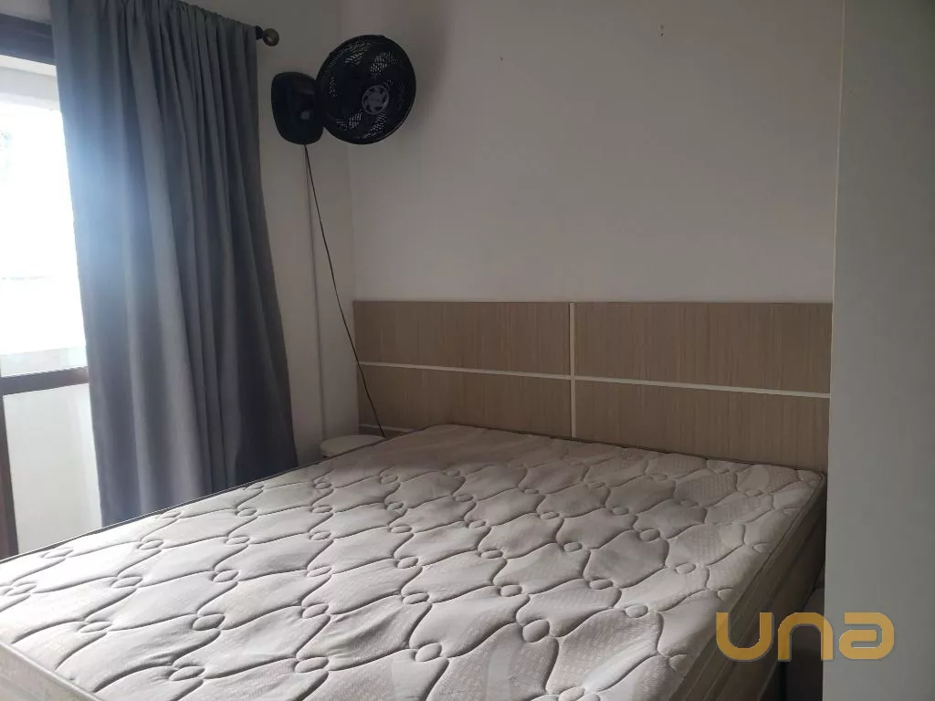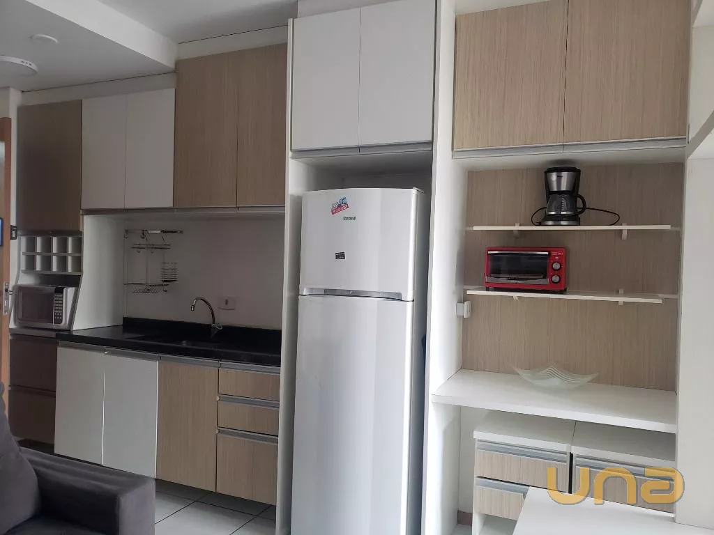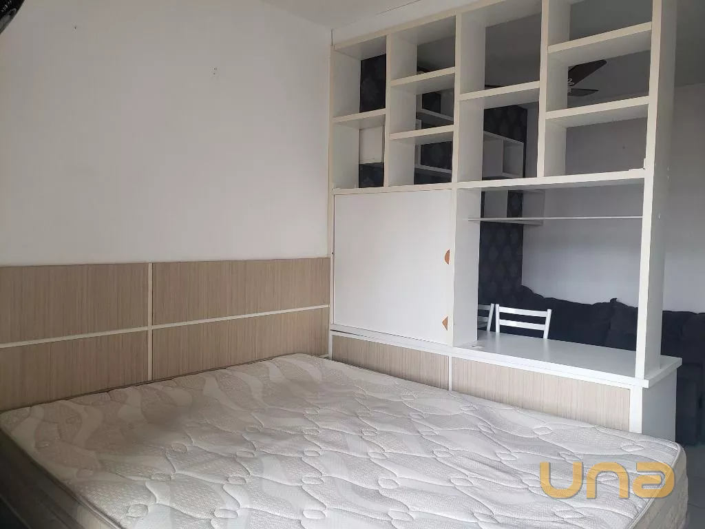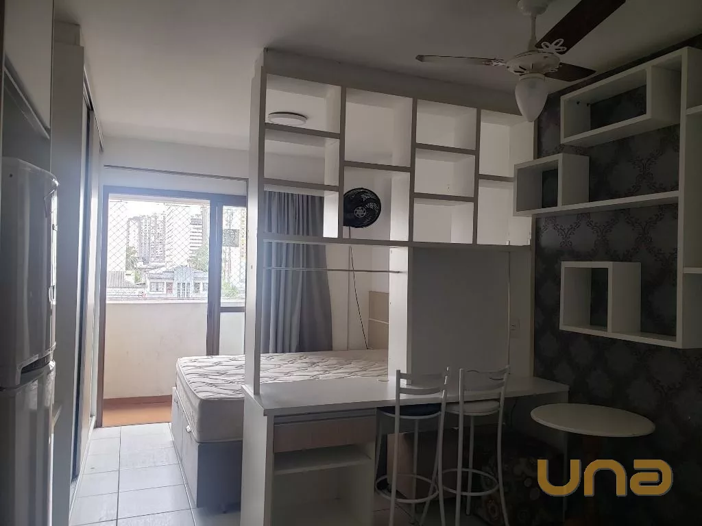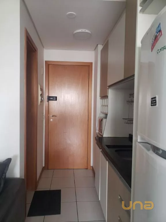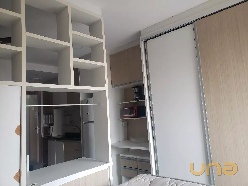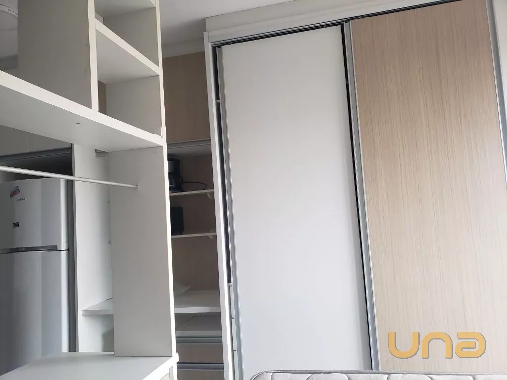 O Studio MOBILIADO, contendo armário e cama no quarto, sala, banheiro e cozinha, eletrodomésticos (geladeira, microondas, sofá e puffs na sala.
