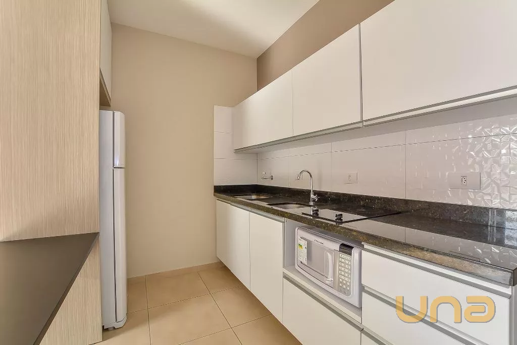 -Cozinha com armários planejados, balcão em granito, cooktop elétrico, geladeira e micro-ondas;