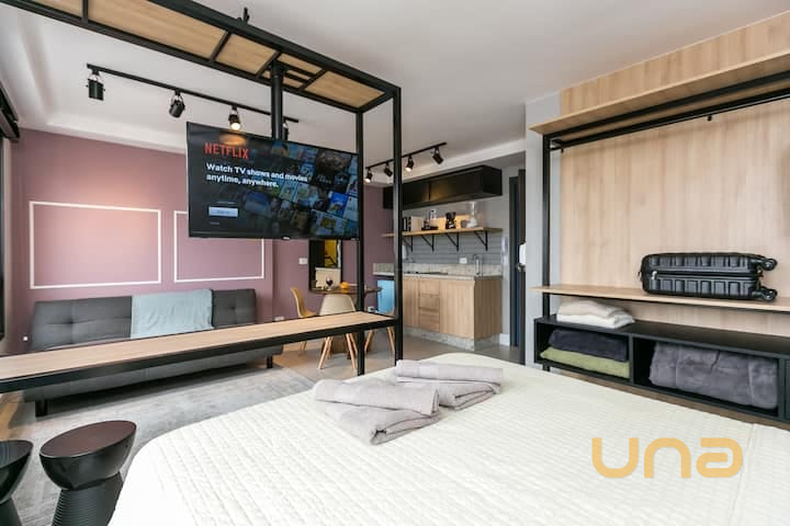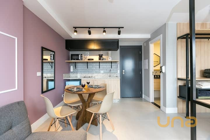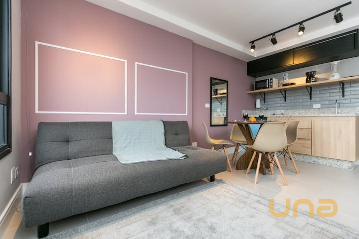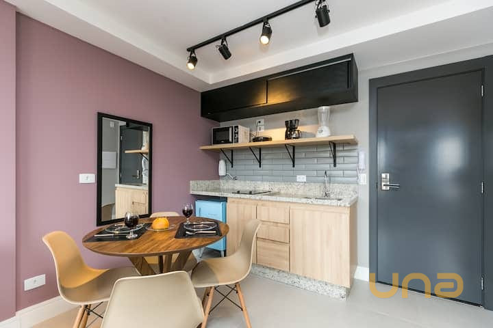Apartamento mobiliado com estilo moderno e arquitetura industrial, ideal para quem busca praticidade e bom gosto no coração de Curitiba. Possui piso em porcelanato fosco e ambientes bem equipados e funcionais.