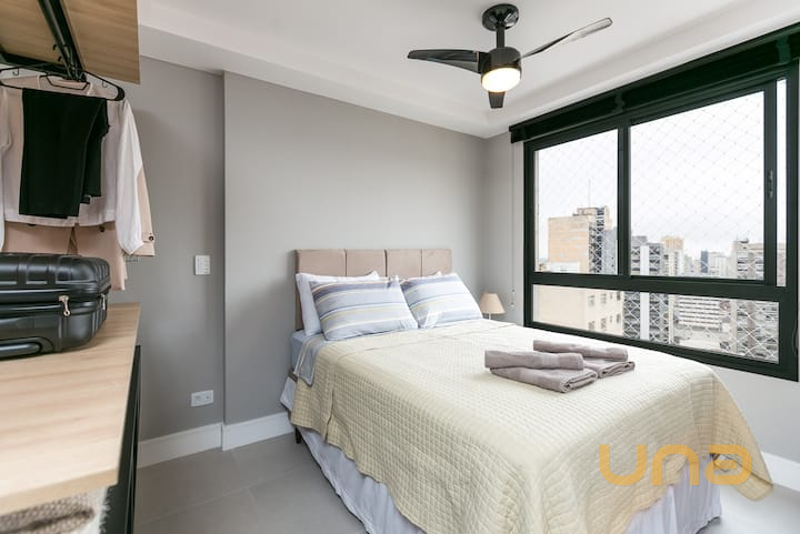 O imóvel conta com ar-condicionado, armários embutidos, cama, frigobar, fogão por indução, micro-ondas, pia e bancada em pedra de granito. Além disso, dispõe de um banheiro completo com box de vidro, pia com armário, espelho e chuveiro a gás. A sala é equipada com sofá-cama, mesa com cadeiras, ventilador de teto, TV e painel.