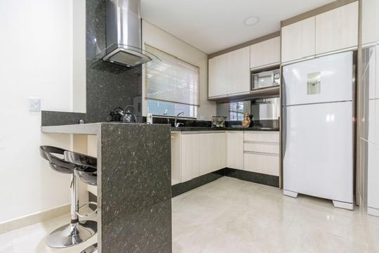Cozinha completa, com armários bem conservados, geladeira, fogão cooktop, forno embutido, exaustor e micro-ondas