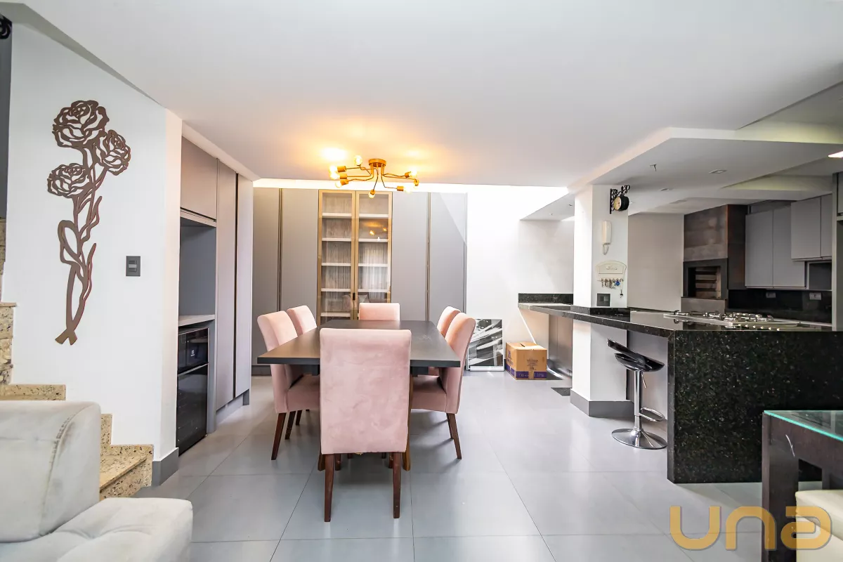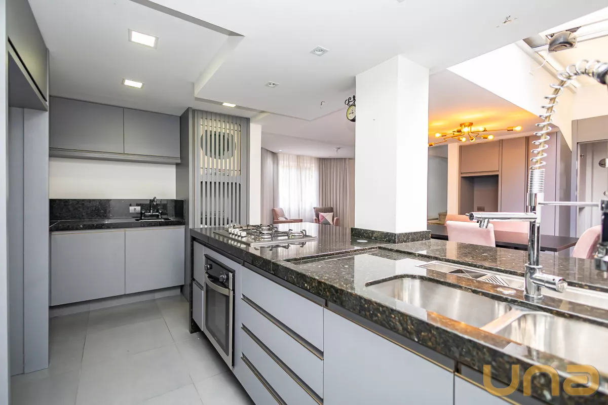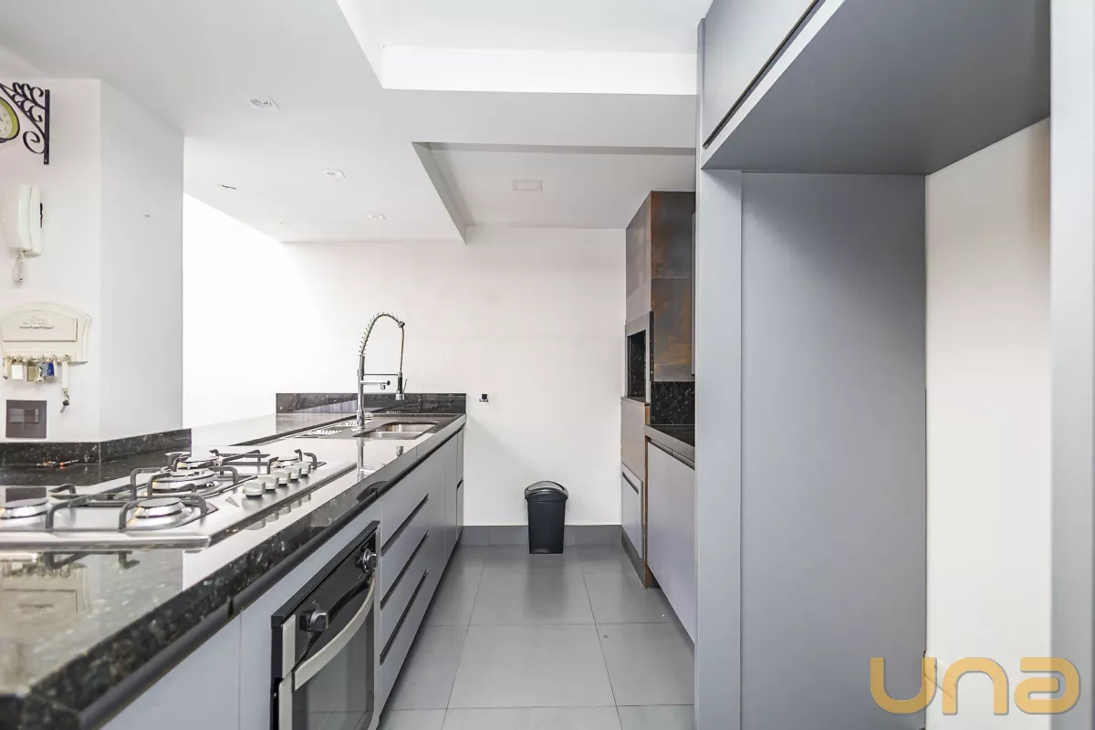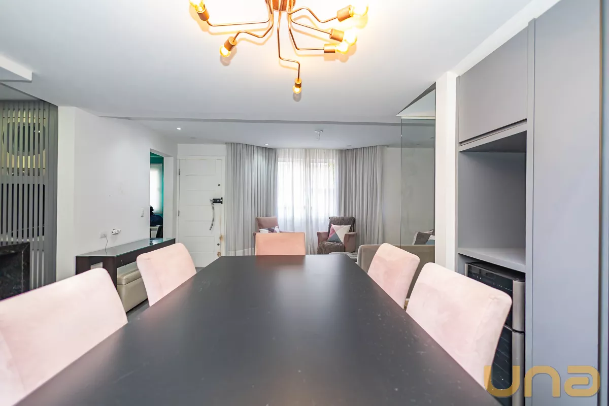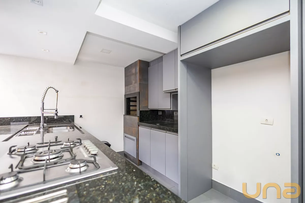 A área social integra sala de estar e jantar em um ambiente amplo e iluminado, conectado à cozinha planejada com armários modernos, bancada em granito, cooktop e forno embutido. Um espaço pensado para o dia a dia e também para receber. Nos fundos, a churrasqueira privativa e o teto retrátil garantem momentos de lazer e praticidade em todas as estações.