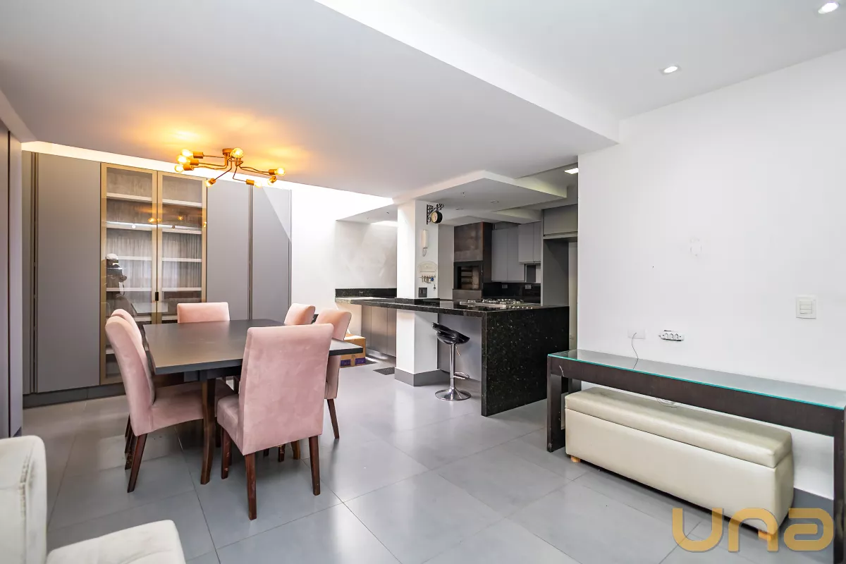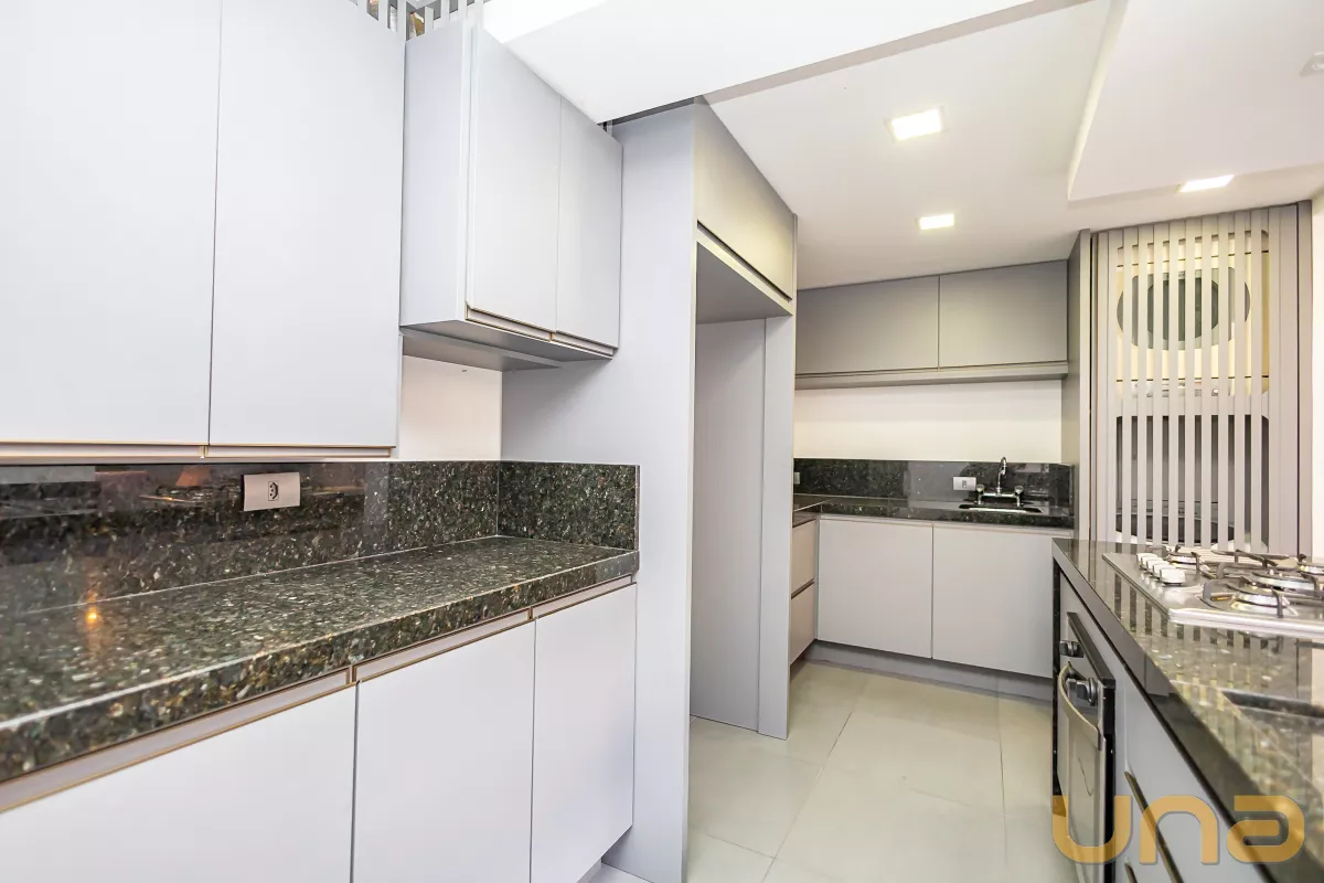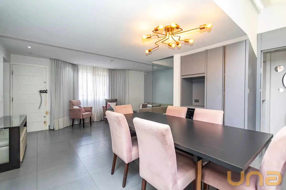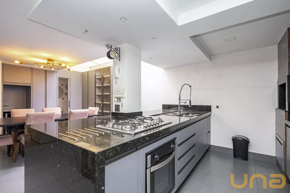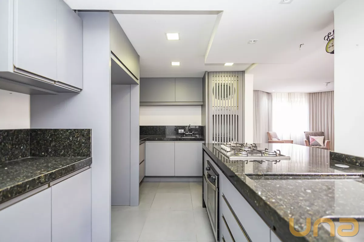 A área social integra sala de estar e jantar em um ambiente amplo e iluminado, conectado à cozinha planejada com armários modernos, bancada em granito, cooktop e forno embutido. Um espaço pensado para o dia a dia e também para receber. Nos fundos, a churrasqueira privativa e o teto retrátil garantem momentos de lazer e praticidade em todas as estações.
