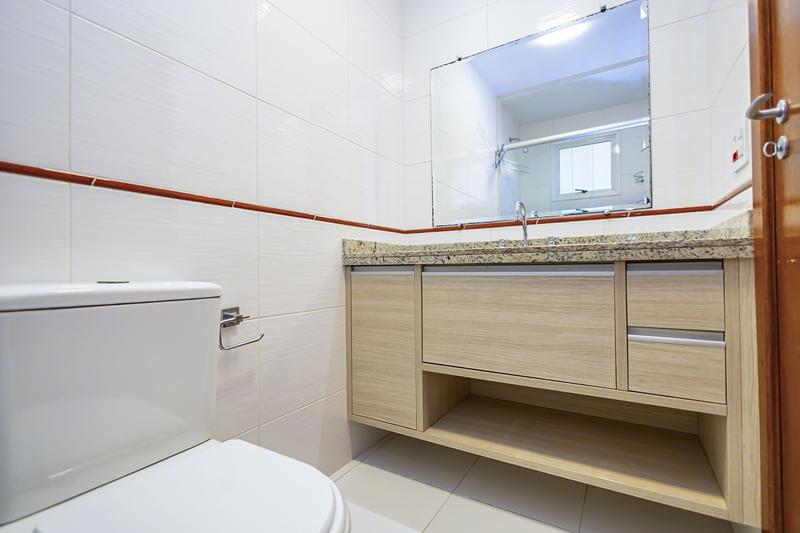 * 1 banheiro social com armário, bancada em granito e box com vidro;