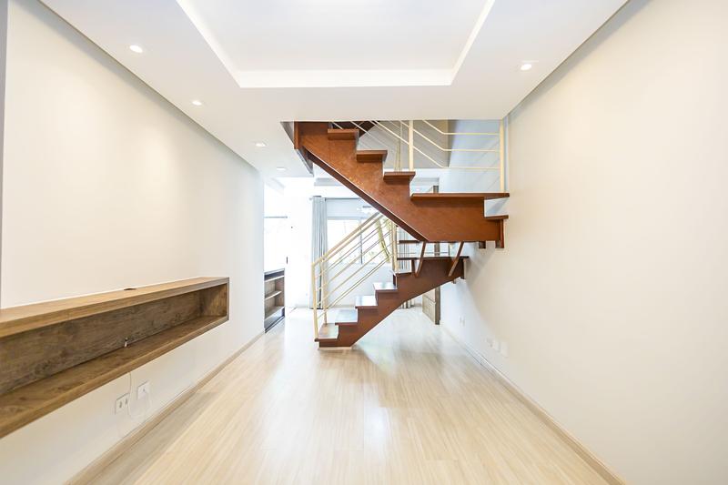 * Sala para 2 ambientes com bancada de canto em madeira, painel de tv, teto em gesso e lâmpadas dicroicas, escada em madeira;