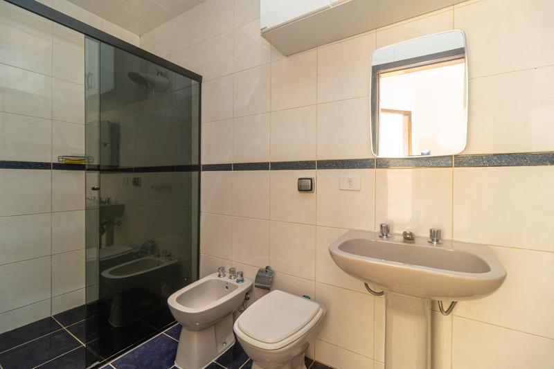 – Banheiro social com armário, espelho e box em vidro;