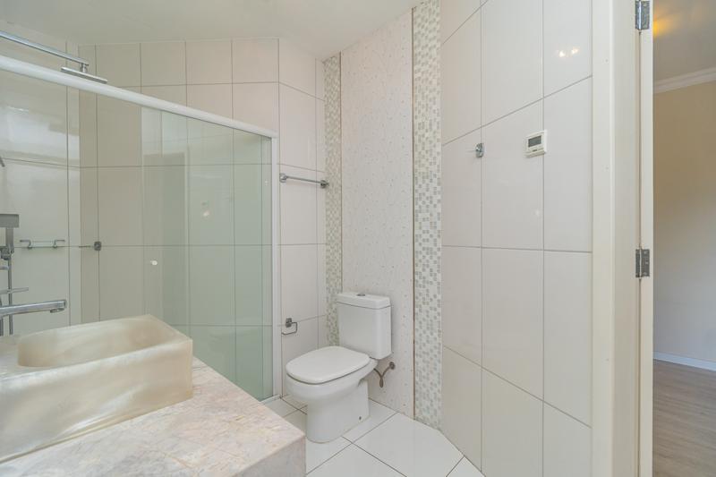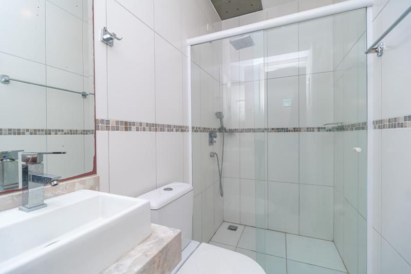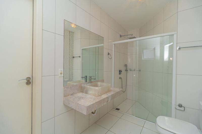 Banheiro social com armário, espelho, box em vidro e piso aquecido
