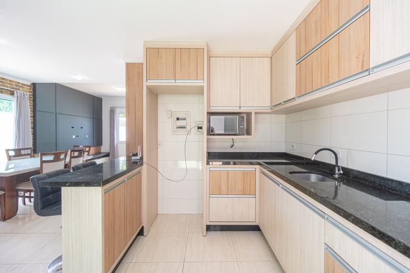 – Cozinha em conceito aberto com armários planejados, fogão e micro-ondas,