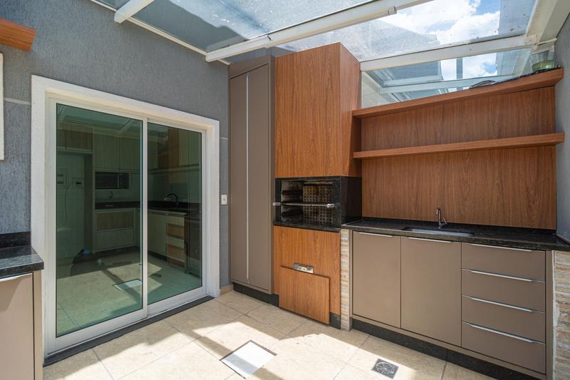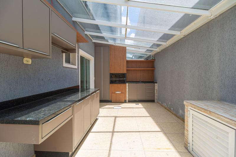 – Espaço coberto nos fundos, possui lavanderia com armários, churrasqueira com balcão, armário e pia,