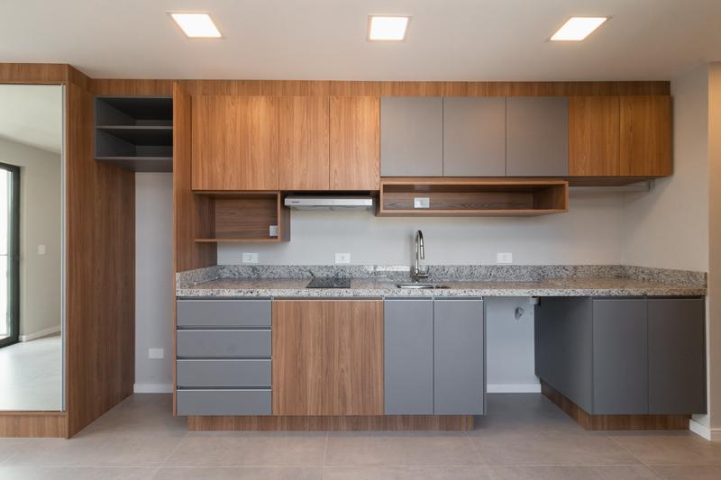Cozinha Planejada – Equipada com armários sob medida, pia com tampo em granito e fogão por indução, unindo funcionalidade e estilo moderno.