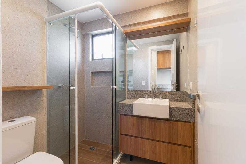 Banheiro Completo – Com box em vidro, espelho amplo e armário, oferecendo conforto e praticidade no seu dia a dia.