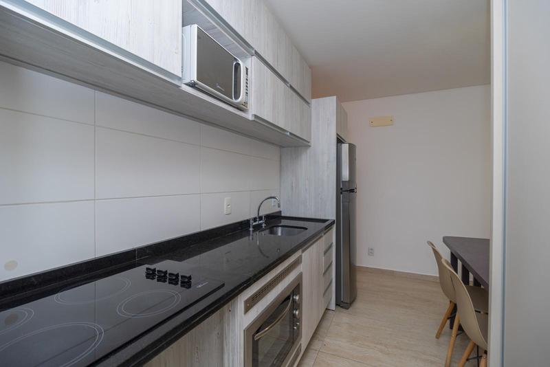 Cozinha americana completa com cooktop, forno, micro-ondas, e bancada com cadeiras.
