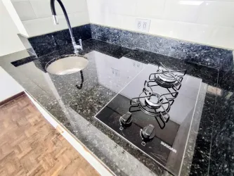 – Tampo de pia em grinito, cooktop integrado (a gás) com utilização de butijão (13 kg)