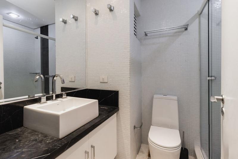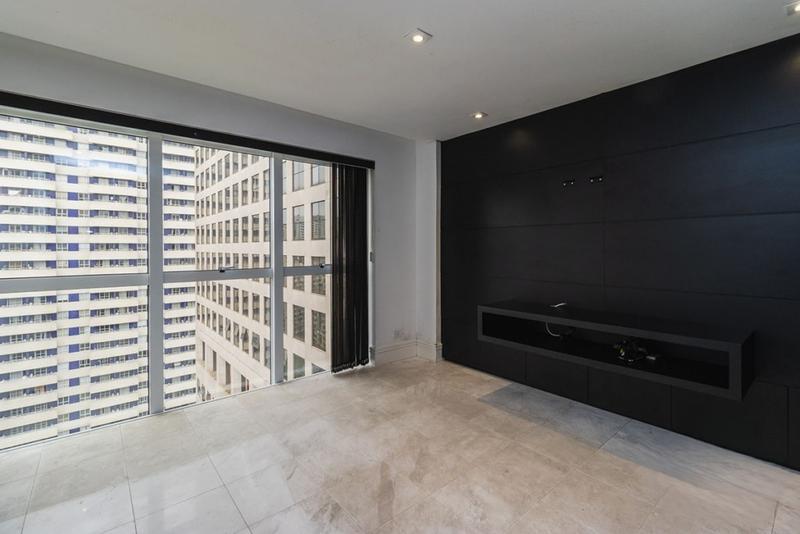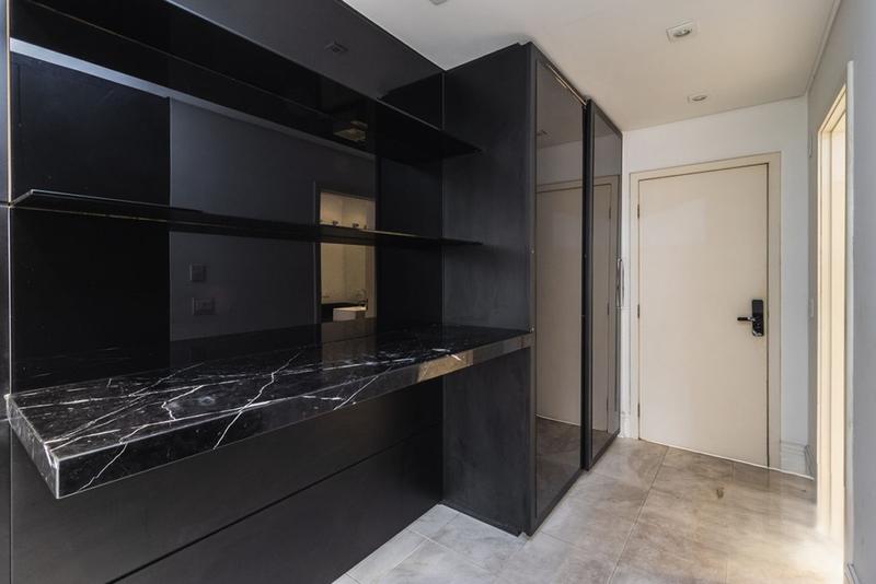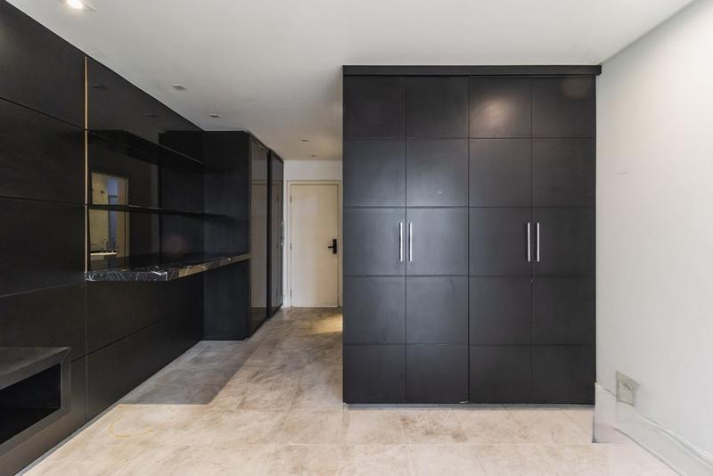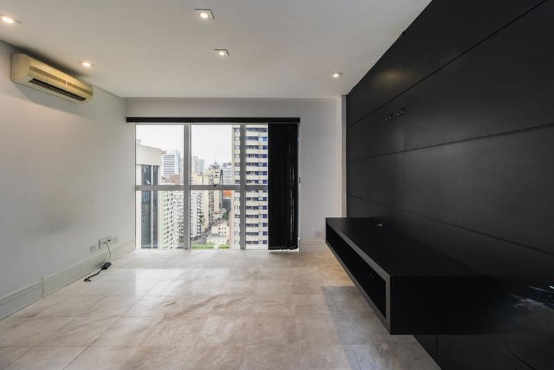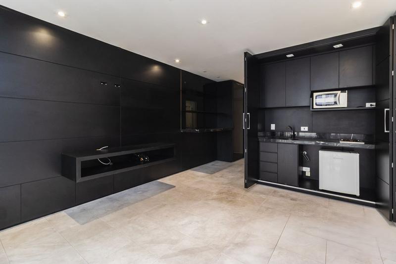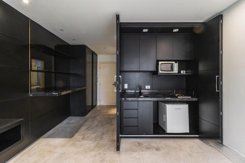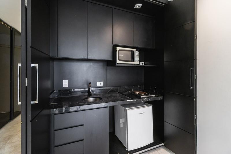 A sala, o quarto e cozinha são integrados em um espaço. O imóvel conta com ar-condicionado, banheiro com armário e box Blindex, amplo painel para TV e com armário embutido, cozinha equipada com armário, cooktop, micro-ondas e frigobar.